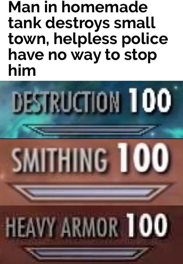 Make skyrim skill meme memes or upload your own images to make custom memes. Sneak 100 meme skyrim memes skyrim memes reddit skyrim memes 100 skyrim meme generator skyrim meme gif skyrim meme video skyrim meme mods . On june 18th, 2017, /r/dankmemes user autistic_spinning posted the first template, in which a video of an escaped prisoner convincing a police officer he was . Destruction 100 restoration 100 lock 100 sneak 100 skyrim 100. Photo © oxford scientific / getty images think memes are inspired by the mysterious workings of the human mind. Shop the meme · protip: It wasn’t too long ago when you needed to have the skill, creativity and, perhaps most importantly, a lot of idle time on your hands to make an effective meme. An image tagged skyrim speech 100,roasted,destruction,destruction 100,roast,roasting. This reaction meme works for when a speech goes well or when it goes badly. 100 skill instead of making another meme template for it. Find and save 100 skyrim memes | from instagram, facebook, tumblr, twitter & more. Looking for some good think memes? Destruction 100 | destruction | image tagged in skyrim skill meme | made w/ imgflip.