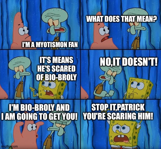 Spongebob, patrick, squidward, scare, ghost. Humor and discussion around u.s. Spongebob claustrophobic, it means he's afraid of santa claus. Make stop it patrick, you're scaring him! Memes or upload your own images to make custom memes. Criticisms and debates are encouraged, . Caption this meme · blank template. Caption this meme all meme . Make stop it patrick, you're scaring him! Politics › stop it patrick you're scaring him memes & gifs. Make your funny memes by captioning this with our online meme maker tool. All memes › stop it patrick, you're scaring him! The meme template of stop it, patrick!